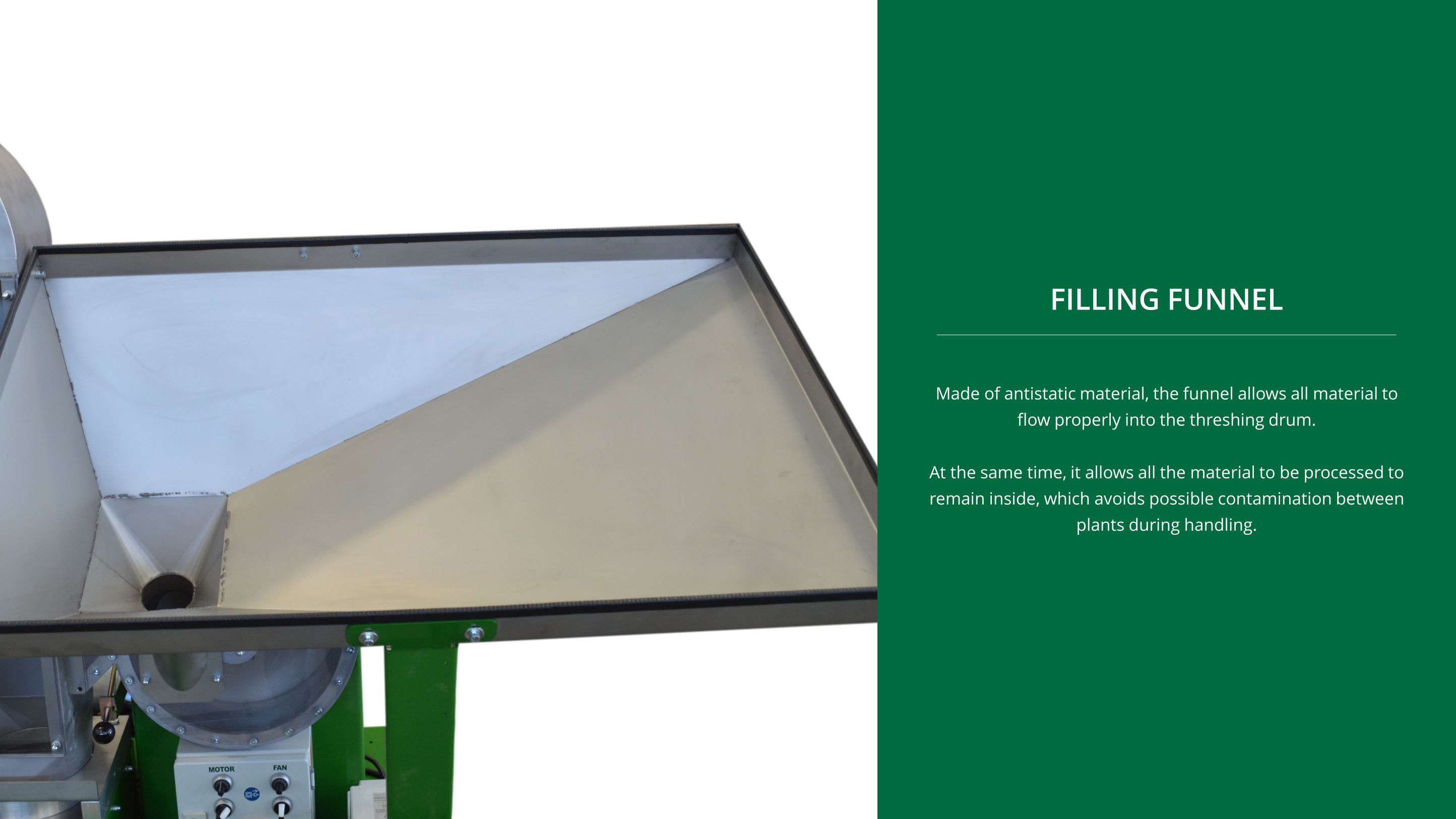 The threshing unit as well as the filling funnel are very large, in order to cope with the special requirements of i.e. canola & soy.