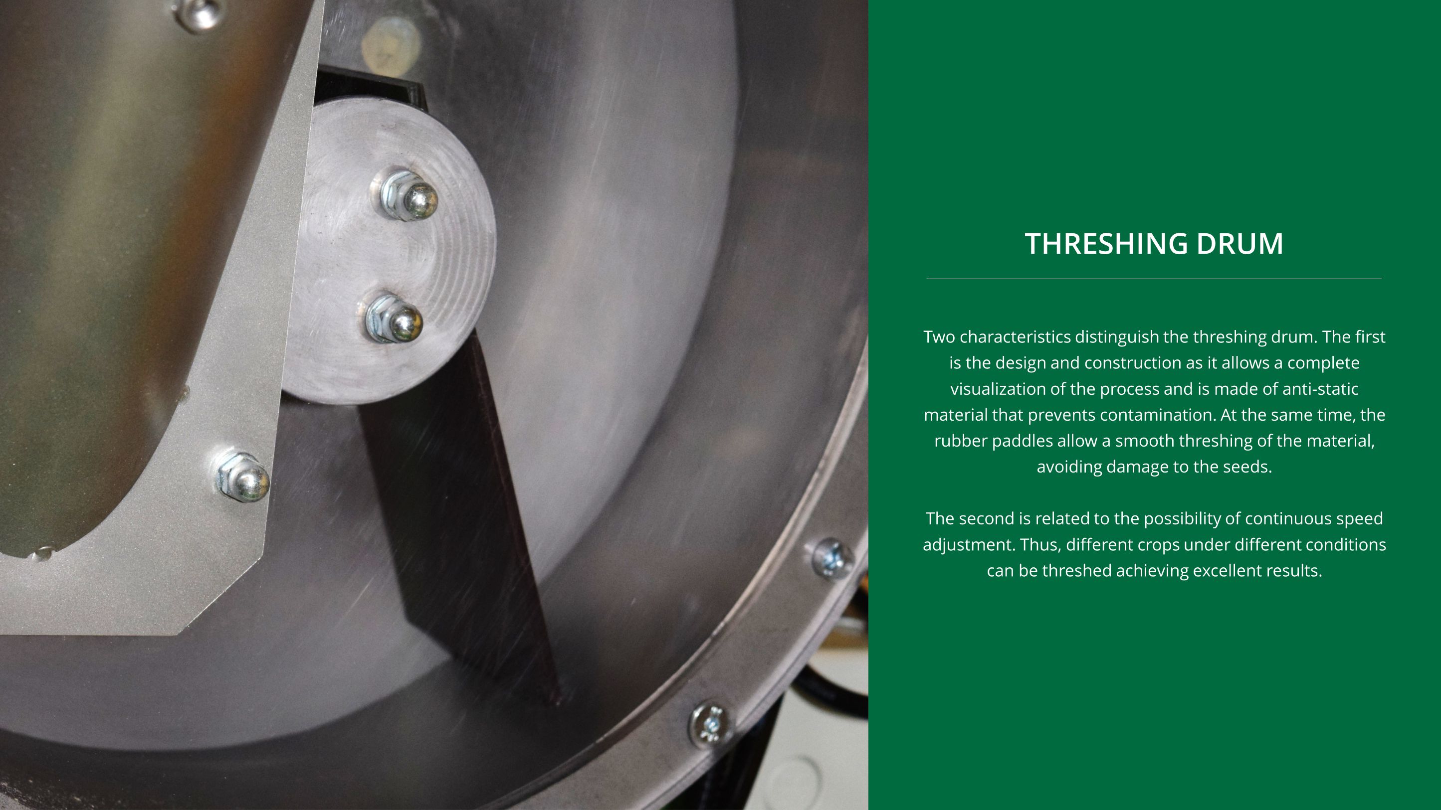 Two polyurethane flails form part of the threshing unit and ensure for a gentle threshing process with nearly no breakage, loss or mixture of grains.