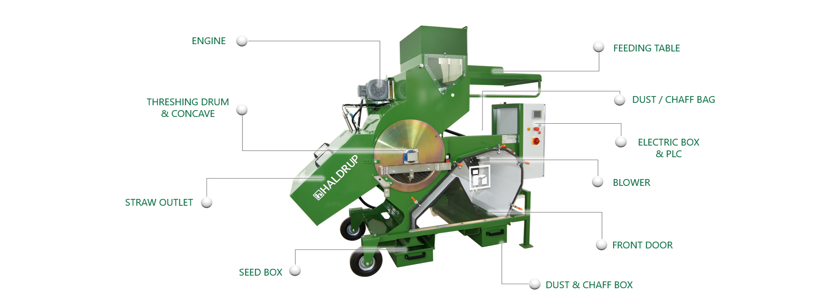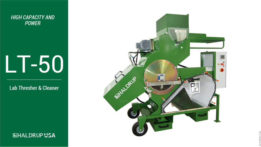 HALDRUP LT-50 is a laboratory thresher for use with large bundles and whole plots, in the field as well as in the lab. Furthermore, work processes can be automated thanks to the machine’s integrated PLC control.