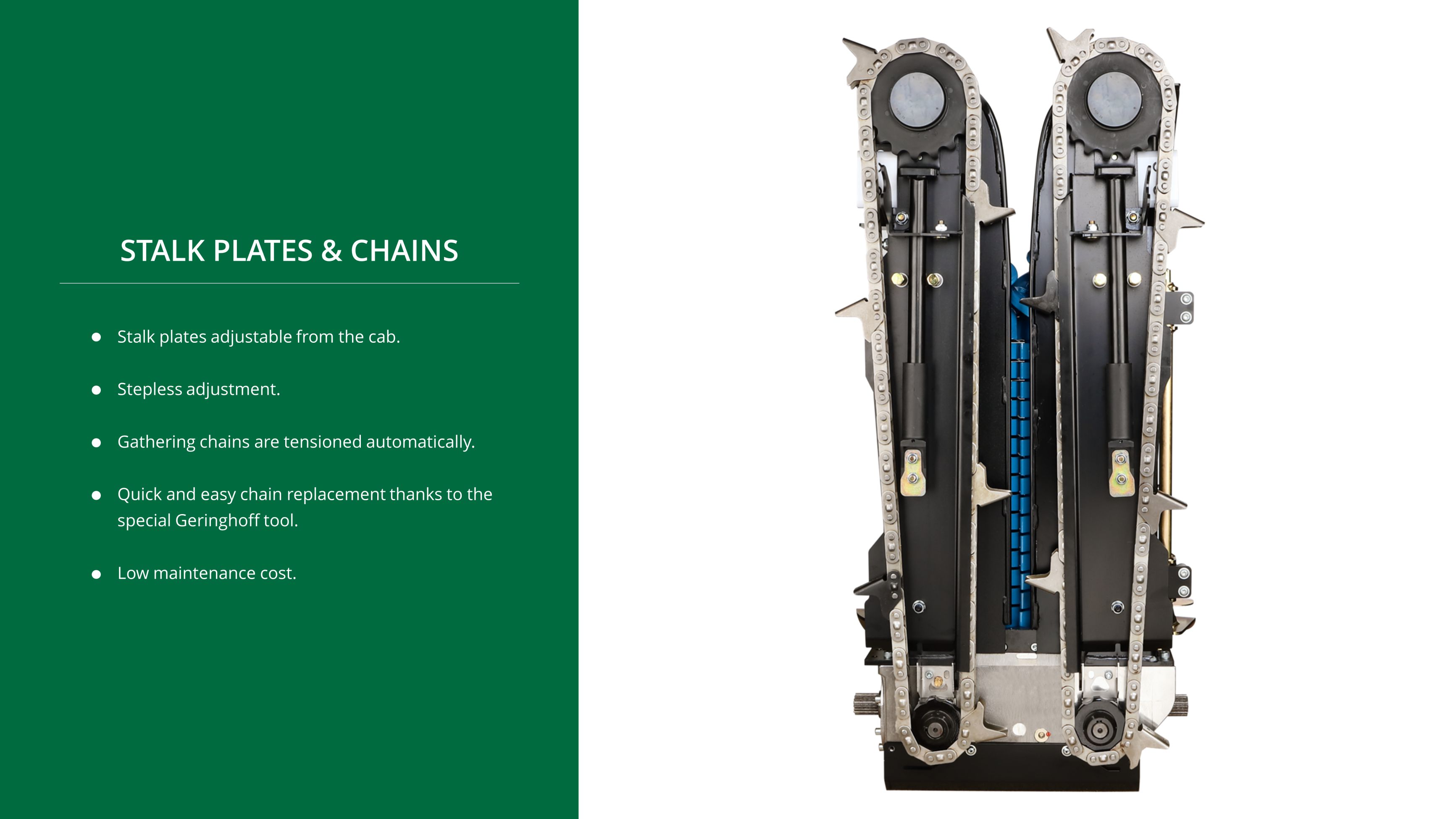 The gathering chains are tensioned automatically. The gathering chain can be changed quickly and easily thanks to the Geringhoff special tool.