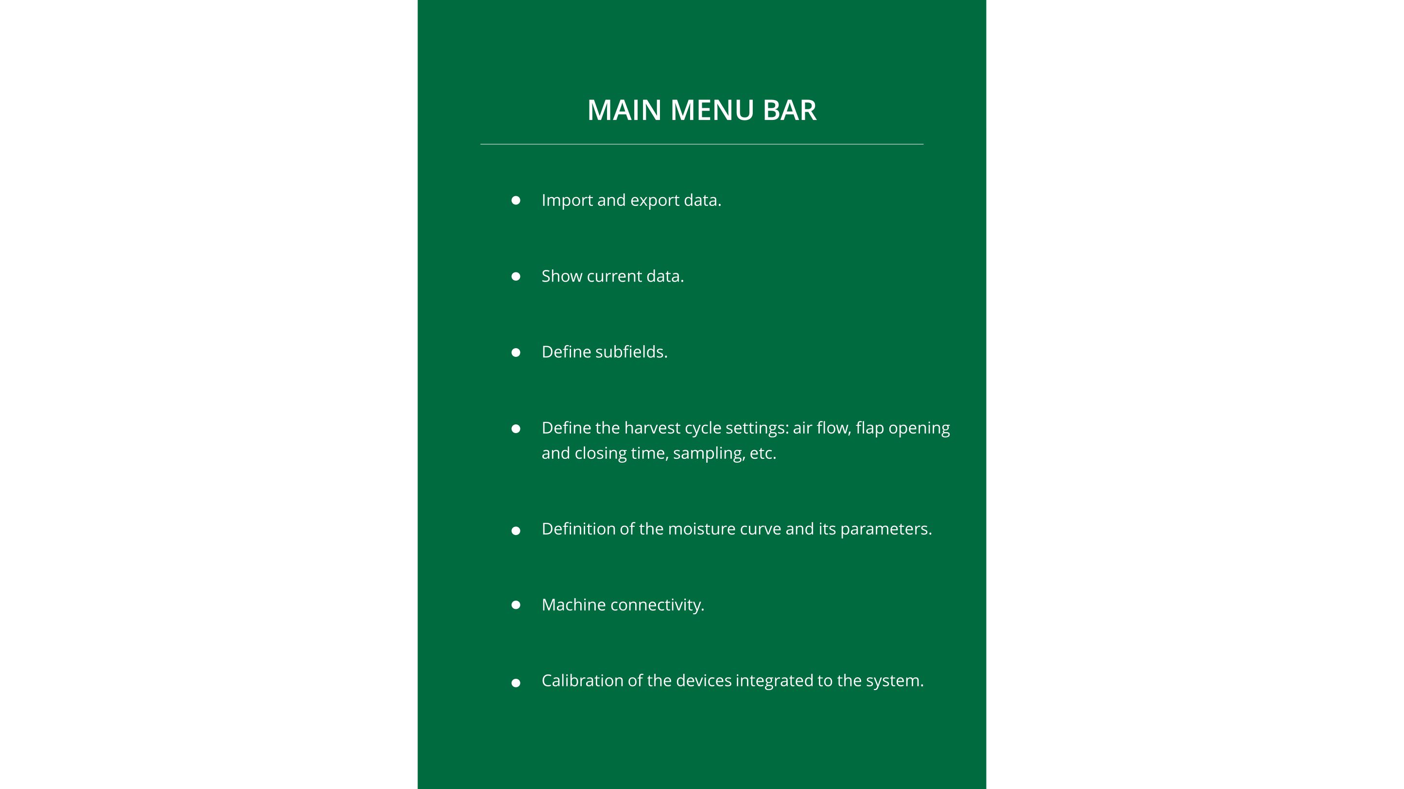 Integrally integrated to HALDRUP machines, this software is capable of importing information, creating fields, executing the harvest and saving the information in a safe and efficient way.