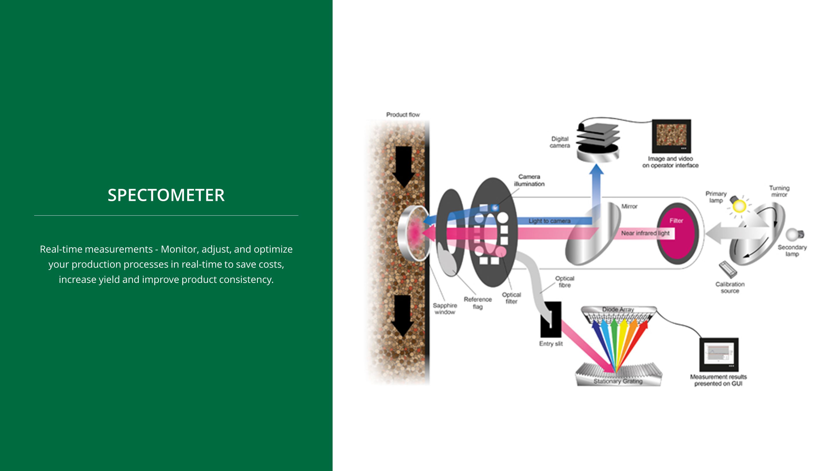 It performs real-time multi-constituent measurements of a product in a processing line providing information for process control and quality monitoring.