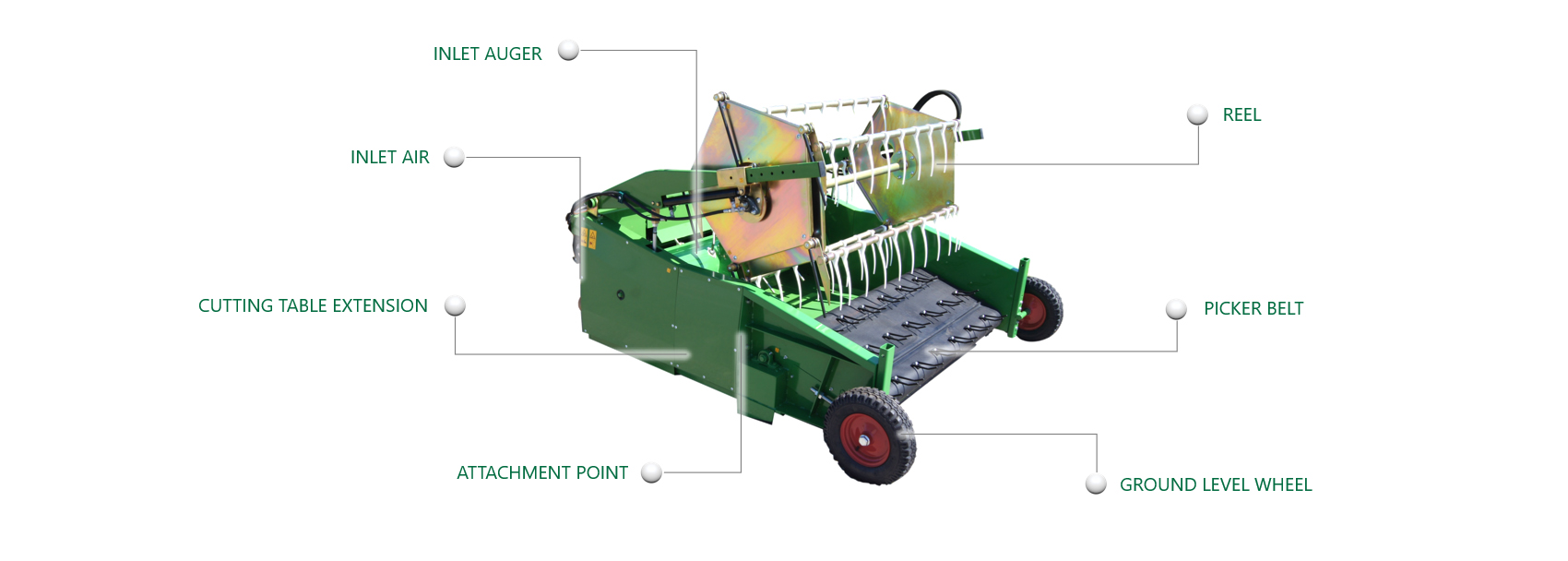 With side wheels, the picker always adjusts the ground level even on uneven terrain, allowing the conveyor belt to lift all material smoothly.