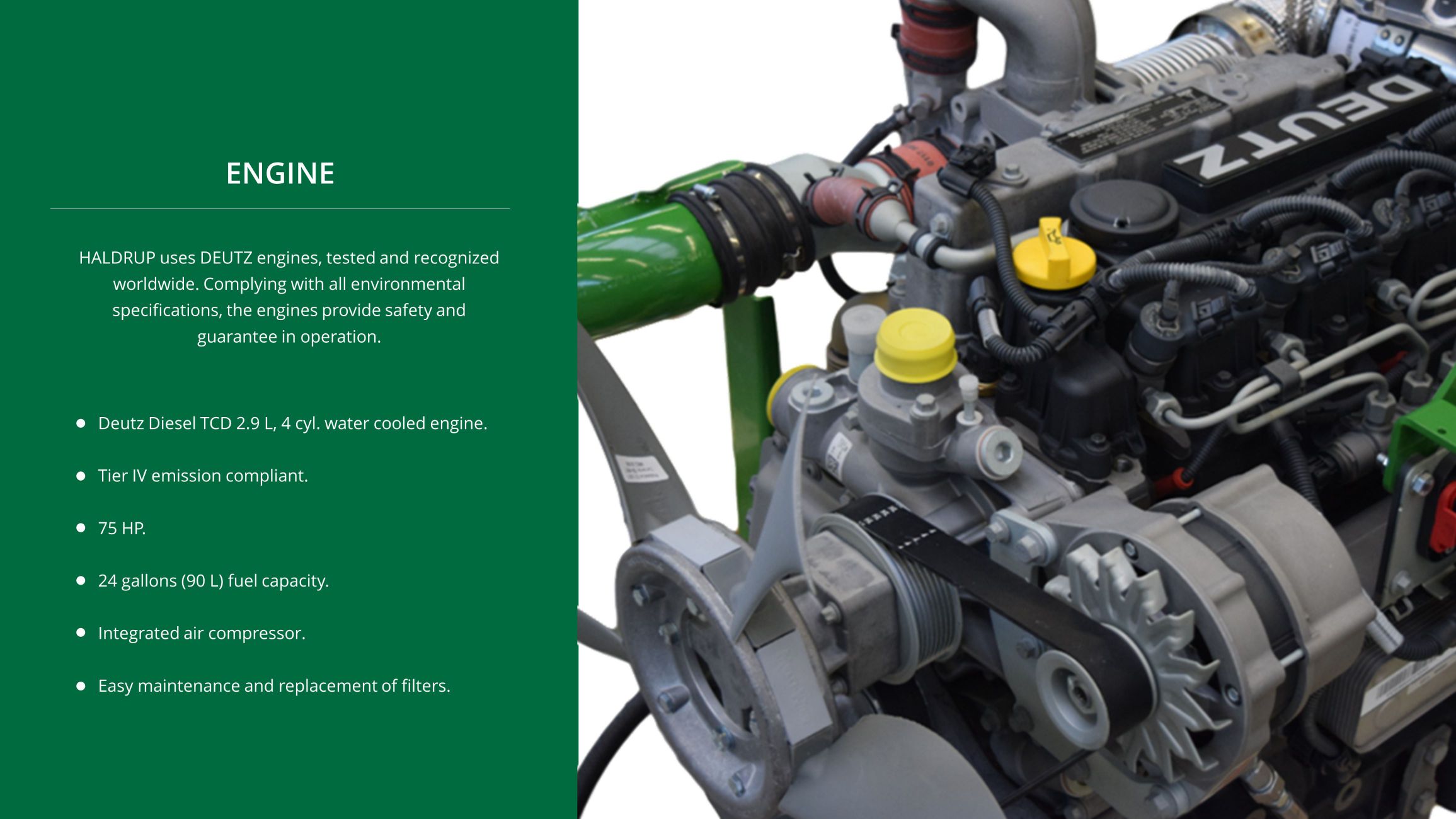 Equipped with a 75 HP diesel engine and hydrostatic transmission allow you to work under different environmental conditions.