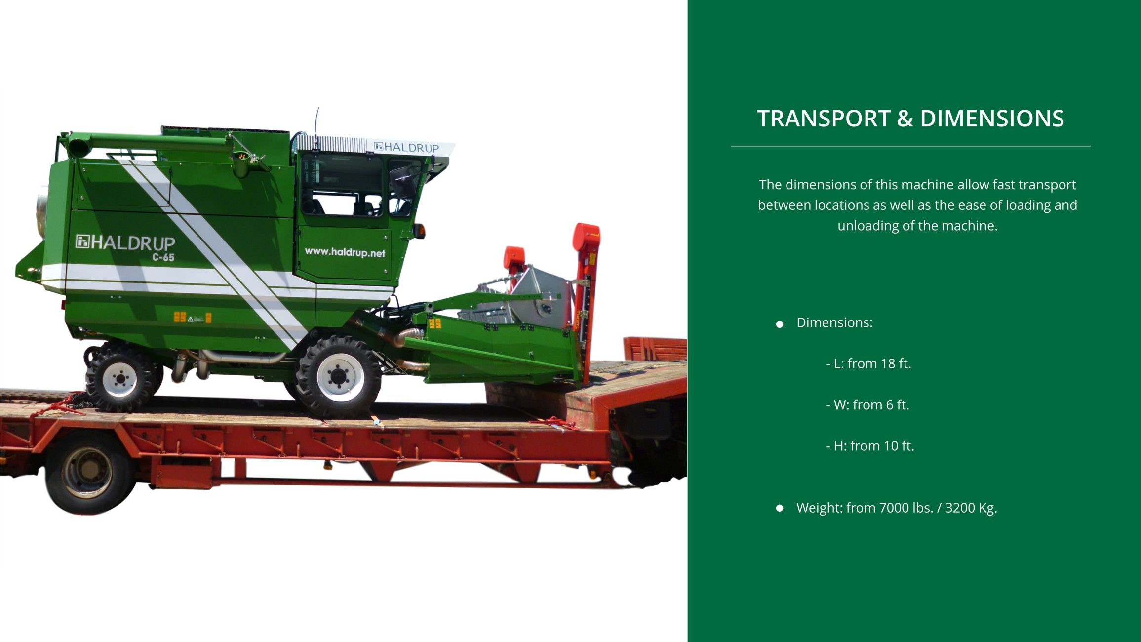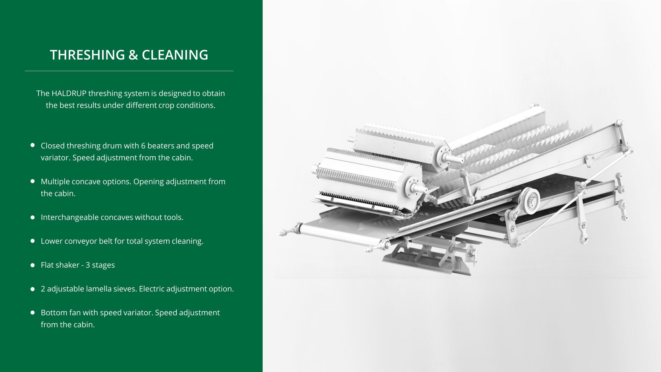 HALDRUP C-65 it is a versatile machine that adapts to all crop conditions. Quick adjustments and user-friendly, it is a machine capable of achieving very good results every day.