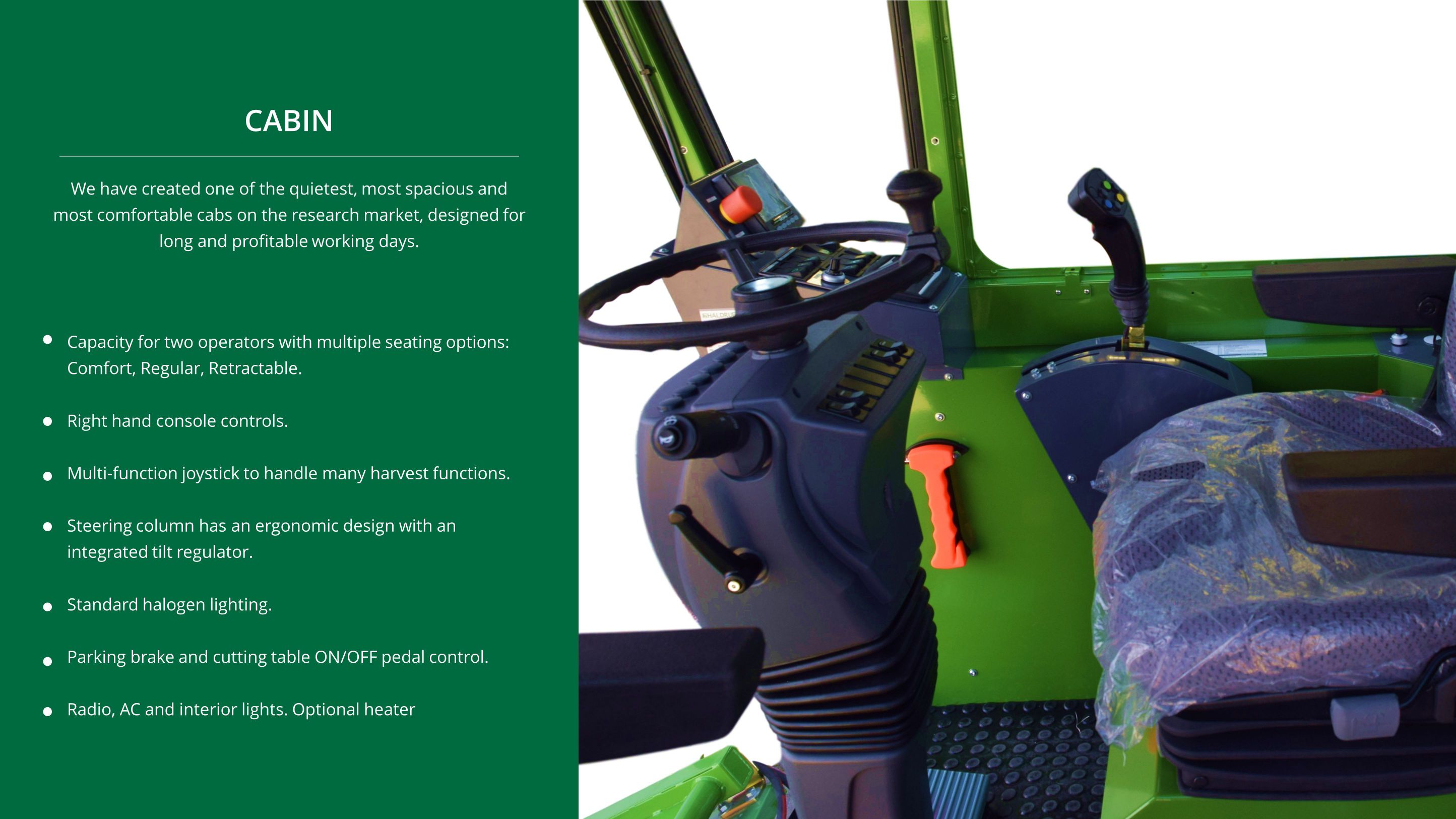 It has a super comfortable cabin with enough space for the driver and a second operator to enjoy a unique work environment.